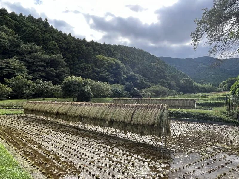 Lors de la balade 日向薬師と彼岸花 du 25 septembre 2022, les cyclistes de Geo Pottering sont passés devant des gerbes de riz accrochées pour le séchage ( 稲架掛け ).