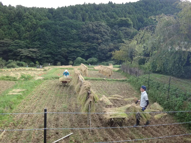 Quand la récolte se fait à la main, sur les petites exploitations, on saisit le kabu d’une main pour le couper de l’autre avec la faucille, à cinq ou six centimètres du sol. Après cinq ou six kabu, on a la main pleine et dépose donc la gerbe ( 稲束 ) sur le sol avant de continuer. La première moitié de la journée de travail est consacrée à la récolte (la coupe, 稲刈り ), puis, dans la deuxième moitié, on lie les gerbes et les accroche ( 稲架掛け ) pour les faire sécher. (👉 source)