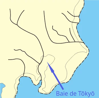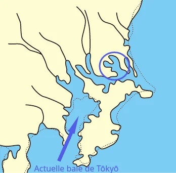 La baie de Tōkyō pendant la période Jōmon, avec ses bras de mer. Celui encerclé en bleu indique l’emplacement de l’actuel lac Kasumigaura. Source : Version modifiée d’une image tirée du site Web du MLIT