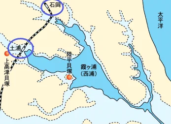 En rouge : les sites de kaizuka Okadaira (陸平貝塚, à droite) et Kamitakatsu (上高津貝塚, à gauche). Cercles bleus : la gare Tsuchiura (en bas) et la gare Ishioka (en haut). Source : Version modifiée d’une image tirée du site Web du MLIT