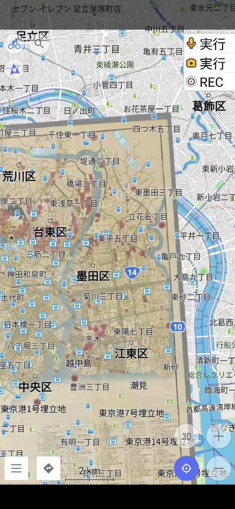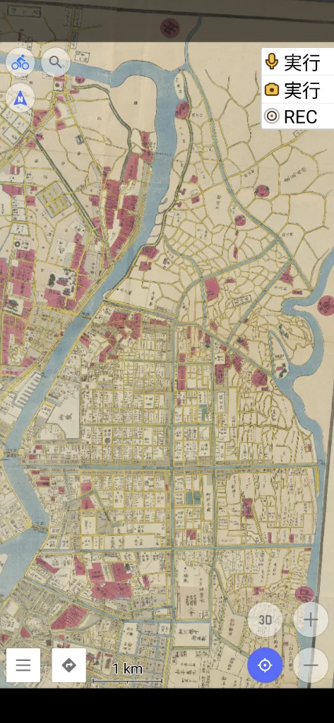 Qu’est-ce à dire ? Simplement qu’on peut prendre une vieille carte d’Edo, la superposer à une carte contemporaine de Tōkyō et naviguer dans le présent tout en regardant le passé sur son téléphone. Laissez-moi vous montrer.