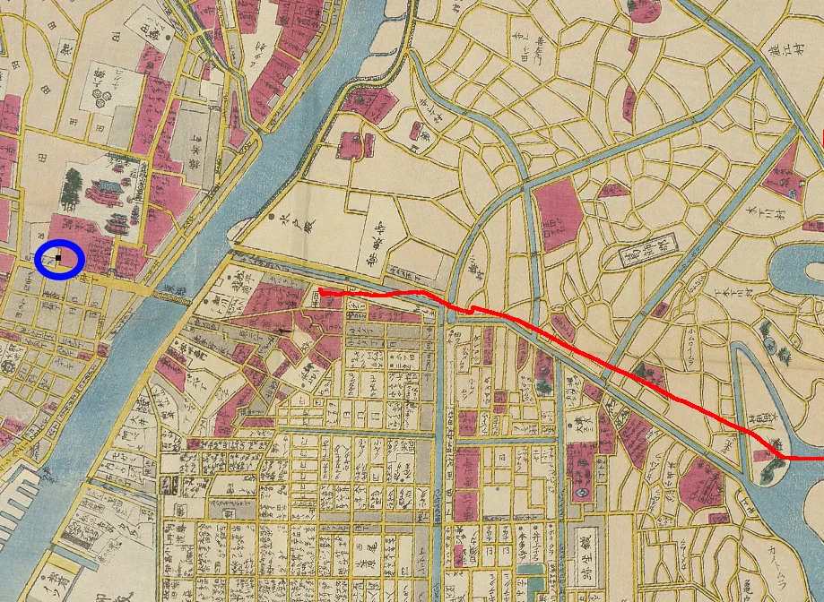 J’ai fait une petite découverte hier, une découverte qui va plaire aux marcheurs qui déambulent dans Tōkyō. Je préparais une petite vidéo à filmer le long de la rivière Kitajūkengawa (北十間川) en direction de la tour Skytree, et en fouillant dans les vielles cartes numérisées d’Edo, j’ai réalisé qu’on y trouvait, en plus des cartes elles-mêmes, des liens vers des fichiers png utilisables en tant que couches sur les applications de navigation GPS pour téléphone.