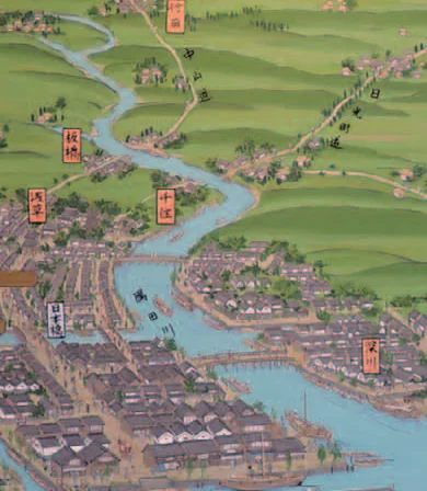 Revenons à notre carte de la plaine d’Edo. Sur le fleuve Sumidagawa, on n’aperçoit que deux ponts. On peut en conclure que ce sont les deux dont nous venons de parler, et que la carte, si elle est fidèle à la réalité historique, présente la plaine entre 1659 (ou 1661), après l’achèvement du Ryōgoku, et 1693, date de construction du troisième pont, le fragile Shin-Ōhashi (新大橋) dont nous avons parlé plus haut… La position des ponts sur la carte correspond par ailleurs à nos attentes, avec le premier (le « Grand pont de Senju ») juste sous Senju (千住, dans le cadre orange), et l’autre plus bas, en aval, à proximité de l’emplacement de l’actuel pont Ryōgoku. Le mystère de la période à laquelle fait référence l’illustration de la plaine semble donc résolu, à une trentaine d’années près, ce qui n’est quand même pas si mal.