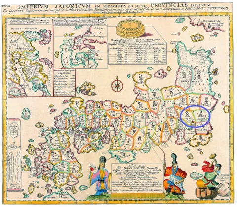 Sur cette adorable carte, juste au-dessus de la baie d’Edo, j’ai encerclé les provinces de Musashino et Shimōsa. Le nom du pont Ryōgoku vient de là : 両国橋, littéralement « le pont des deux provinces », donc le pont entre les deux provinces. Initialement, Ieyasu n’avait pas autorisé la construction d’autres ponts que le Grand pont de Senju (1594) sur le fleuve Sumidagawa, afin de mieux protéger la ville contre les provinces voisines. Ce n’est qu’après le Grand incendie de Meireki de 1657 que le gouvernement militaire (bakufu) modifia cette politique, car l’absence de ponts avait empêché la population de fuir les flammes. C’est à la suite de ce revirement de la politique en matière de ponts que le pont Ryōgoku a été construit.