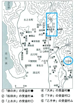 C’est en 1542 qu’AZAI Hisamasa prend la tête du clan Azai et devient ainsi seigneur du fief Ōmi. Sur ce fief, il y a une importante rivière, la Takatokigawa (高時川), sur laquelle les paysans ont construit six écluses et des canaux de déviation pour alimenter leurs rizières. Sur la carte ci-dessous, elles sont numérotées de ① à ⑥ et encadrées en bleu.