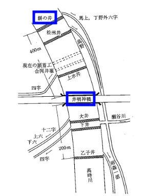 C’est de cette légende que vient le nom de la nouvelle écluse (ou du nom de cette écluse que vient la légende) : l’écluse des mochi ( 餅の井 ). Sur le schéma ci-dessous, la nouvelle écluse est encadrée en bleu, ainsi que le pont Imyōjin (井明神橋), qui va jouer un rôle important par la suite, comme nous allons le voir.