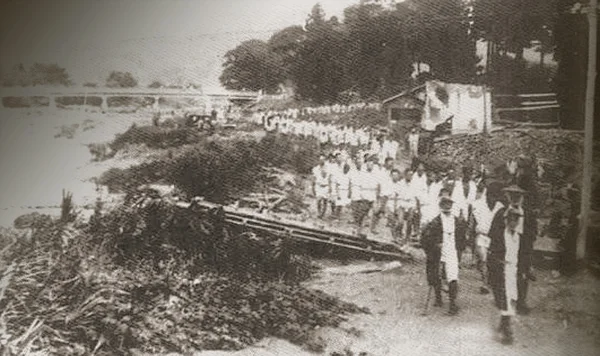 La longue procession de paysans se dirige vers l’écluse à retirer. (Source : 湖北の祈りと農, Chapitre 4)