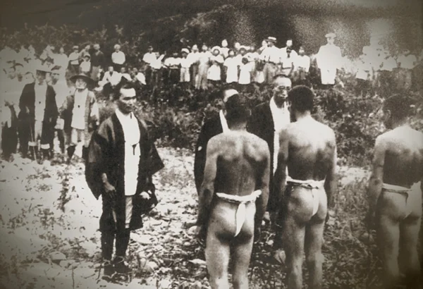 Les officiels, portant les vêtements cérémoniels de leur écluse (qui variaient d’une écluse à l’autre), annoncent aux défenseurs de l’écluse des mochi qu’ils sont venus la détruire. Les défenseurs de cette écluse portent simplement un fundoshi. (Source : 湖北の祈りと農, Chapitre 4)