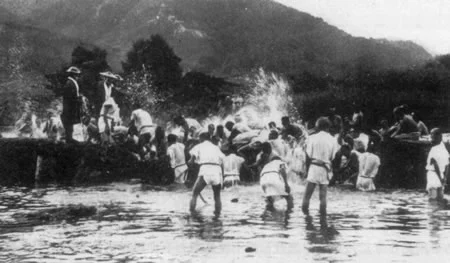 Les paysans de l’écluse en aval détruisent l’écluse. Les grosses éclaboussures, à l’arrière-plan, sont celles des défenseurs de l’écluse, qui aspergent les destructeurs pour symboliser la résistance des paysans de l’amont. (Source : 水土里ネット湖北)