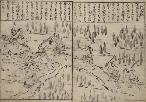 Illustration d’une querelle entre paysans, vraisemblablement au sujet de l’eau, sur une digue qui sépare trois parcelles, dont une visiblement à sec. Source : 大和耕作絵抄 , Collection numérique de l’Université de Tsukuba.