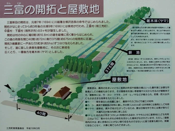 Ce type très particulier d’exploitation agricole, dont il reste encore quelques fragments intacts, a permis de conquérir une section relativement aride du plateau de Musashino, au cœur de ce qui, aujourd’hui, constitue la préfecture de Saitama, juste au nord de la région métropolitaine de Tōkyō.