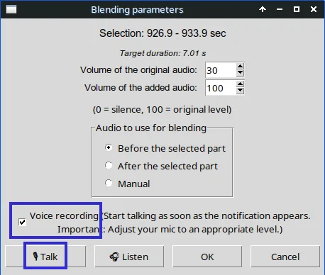 J’ai sélectionné la section de 7 secondes pendant laquelle on entend le bruit du moteur. Dans les paramètres de mixage (Blending parameters sur l’image), je peux choisir le niveau sonore de ces 7 secondes (Volume of the original audio), ainsi que celui de l’audio que je vais fusionner à ces 7 secondes (Volume of the added audio).