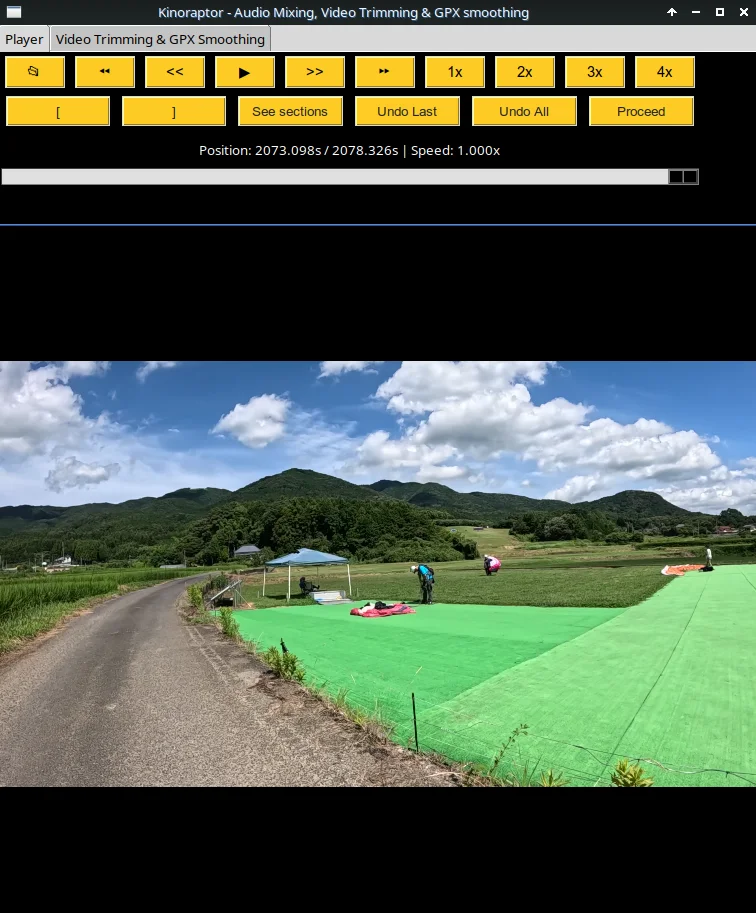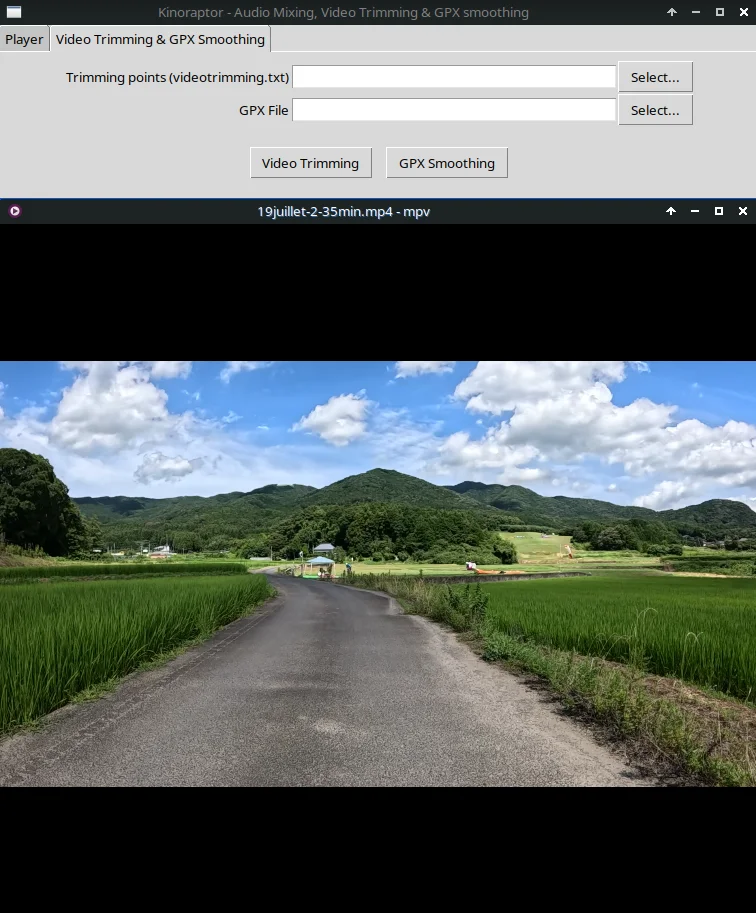 Dans le coin supérieur gauche, un onglet [Player] pour la lecture de la vidéo, et un autre onglet pour le découpage vidéo et le lissage de la pente. Je n’ai pas ajouté de bouton pour le découpage vidéo dans le menu, parce que je l’aime bien comme ça ; les points de début et de fin, pour les sections à couper, s’insèrent tout simplement avec les combinaisons de touches de clavier Ctrl-i (pour in) et Ctrl-o (pour out). Tous ces points de début et de fin de sections à couper se trouvent sur des images clés du fichier de la GoPro, et si par hasard le lecteur MPV ne se trouve pas précisément (suite à un déplacement image par image au lieu de seconde par seconde), Kinodioraptor leur donne un petit coup de langue en coulisses, lors du traitement de découpe, pour les remettre à la bonne place.