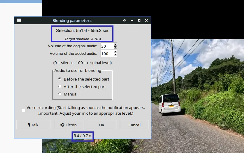 Ici, la section à mixer est d’une durée de 3,7 secondes, mais quand on clique sur [Listen], Kinodioraptor lit un échantillon de 9,7 secondes pour permettre de vérifier la fluidité de la transition.
