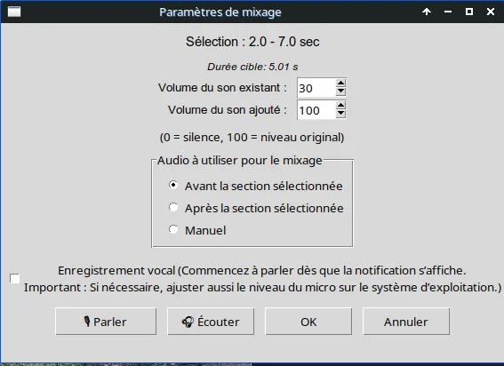 Ceux pour l’édition audio sont expliqués sur le menu lui-même, quand vous mettez le pointeur de la souris sur les boutons. Voici quand même les grandes lignes de la procédure :
