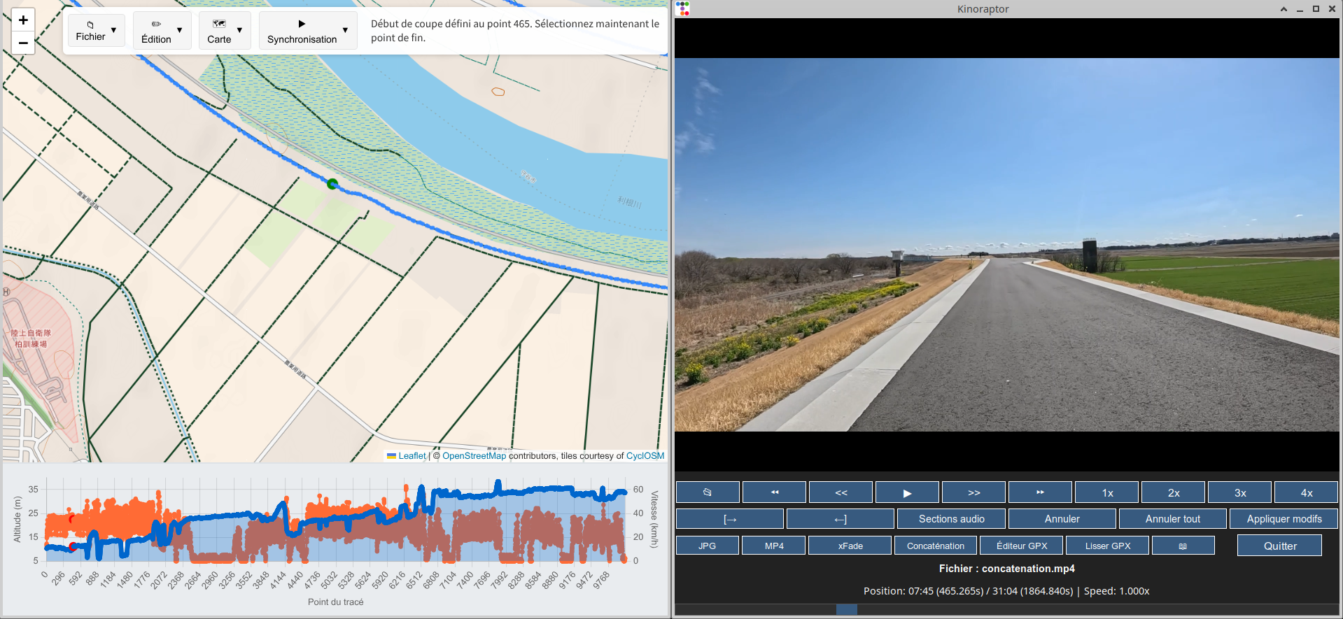Parmi les dernières nouveautés, il y a d’abord la synchronisation du tracé de la balade avec la lecture vidéo, et vice-versa, et la découpe automatique du fichier gpx (concrètement, si je coupe un bout de vidéo, la partie correspondante du tracé disparaît automatiquement et l’heure des points qui suivent la coupure s’ajuste d’elle-même). La carte du tracé s’affiche maintenant dans un navigateur Web, beaucoup plus efficace que l’ancienne interface ; un petit serveur web local généré automatiquement par Kinoraptor se charge de synchroniser le déplacement du cycliste sur la carte avec la lecture de la vidéo.