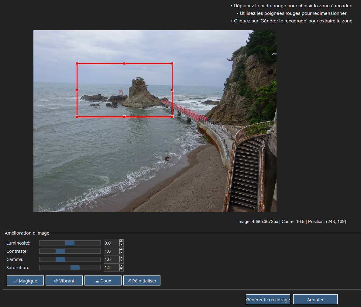 Dans le même ordre d’idée, j’ai aussi ajouté à cet Atelier une fonction de recadrage et d’ajustement du rendu des images fixes (ici aussi : luminosité, contraste, gamma et saturation), qui m’ouvre de nouvelles possibilités sans utiliser d’autre programme que Kinoraptor. Concrètement, si je roule lentement à la campagne et qu’il n’y a pas de trafic, je pourrai saisir mon téléphone d’une main et prendre une photo haute résolution d’un paysage intéressant, dont je ne garderai ensuite que la partie désirée pour l’ajouter à la vidéo avec un effet xFade.