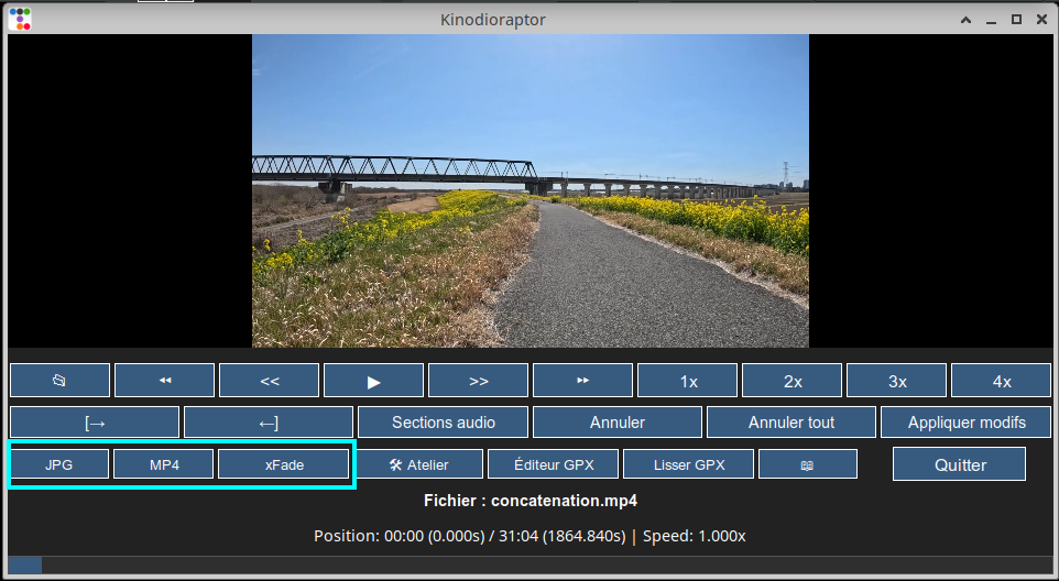 Sous la première ligne de boutons, consacrée aux commandes de lecture, il y a une ligne de boutons d’édition de la piste audio (pour rappel, elle sert principalement à atténuer le bruit des voitures lorsque nécessaire) issus de l’ancienne mouture du programme. Sous cette ligne, une troisième ligne regroupe toutes les fonctions de traitement d’images fixes et de fichiers vidéo. Le bouton JPG sert à créer des images fixes aux points de début et de fin des coupures de la vidéo, afin de faire un effet xFade sous forme de petit fichier mp4 à introduire, par exemple, à la place d’un long arrêt devant un feu rouge.