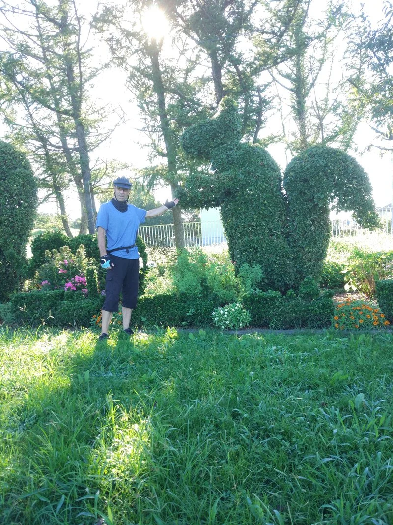 Sur la rive sud de la rivière Kokaigawa, se trouve un petit élevage de poneys (小貝川ポニー牧場)où quelques arbustes sont taillés sous des formes animales. Comme cet écureuil ne mordait pas, je suis descendu de vélo pour aller lui serrer la main.