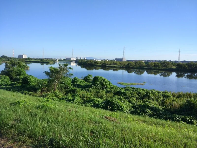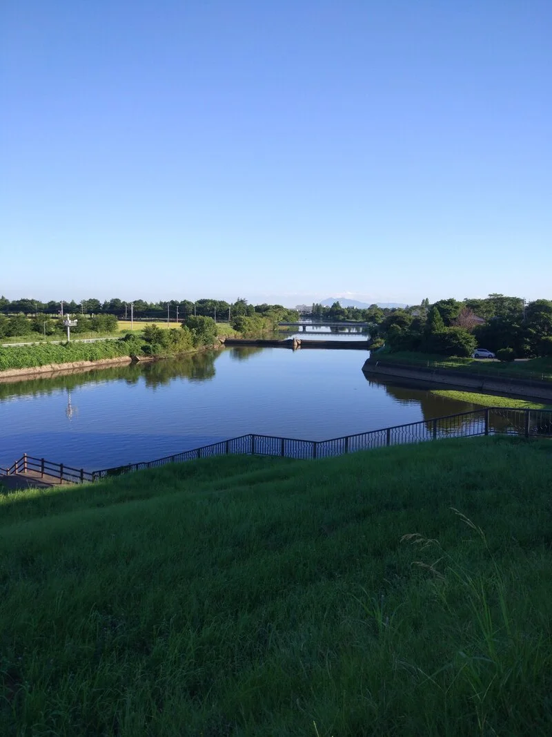 Le mont Tsukuba à l’horizon de la petite rivière Kitauragawa (北浦川), photographié avec la rivière Kokagaiwa (小貝川) dans le dos. Matin du 19 août 2022 sous un ciel radieux.