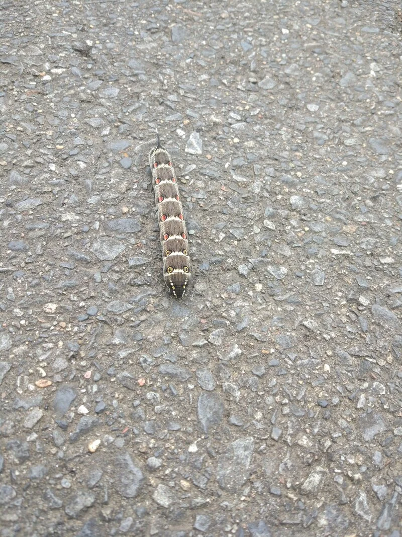 Celle-ci montre une chenille (毛虫) en train de traverser la piste cyclable. Après avoir pris la photo, je l’ai partagée sur le groupe privé de Geo Pottering sur l’application Line, et 12 minutes plus tard un membre m’a informé qu’il s’agissait de セスジスズメ, donc de Theretra oldenlandiae, dixit Wikipédia.