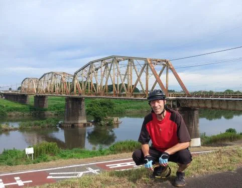 Photo : À mi-chemin devant un pont ferroviaire tout rouillé qui traverse le fleuve Edo à la hauteur de Kasukabe (春日部).