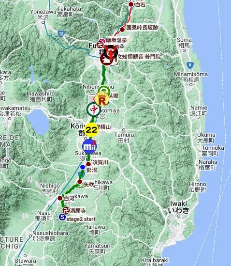 Actuellement à 111,2 km de la ligne de départ (Barrière de Shirakawa), je viens tout juste de dépasser, au Kilomètre 107, la pierre appelée shinobu mojizuri ishi (しのぶもぢ摺り石), qui fait partie des lieux à visiter le long du parcours virtuel.