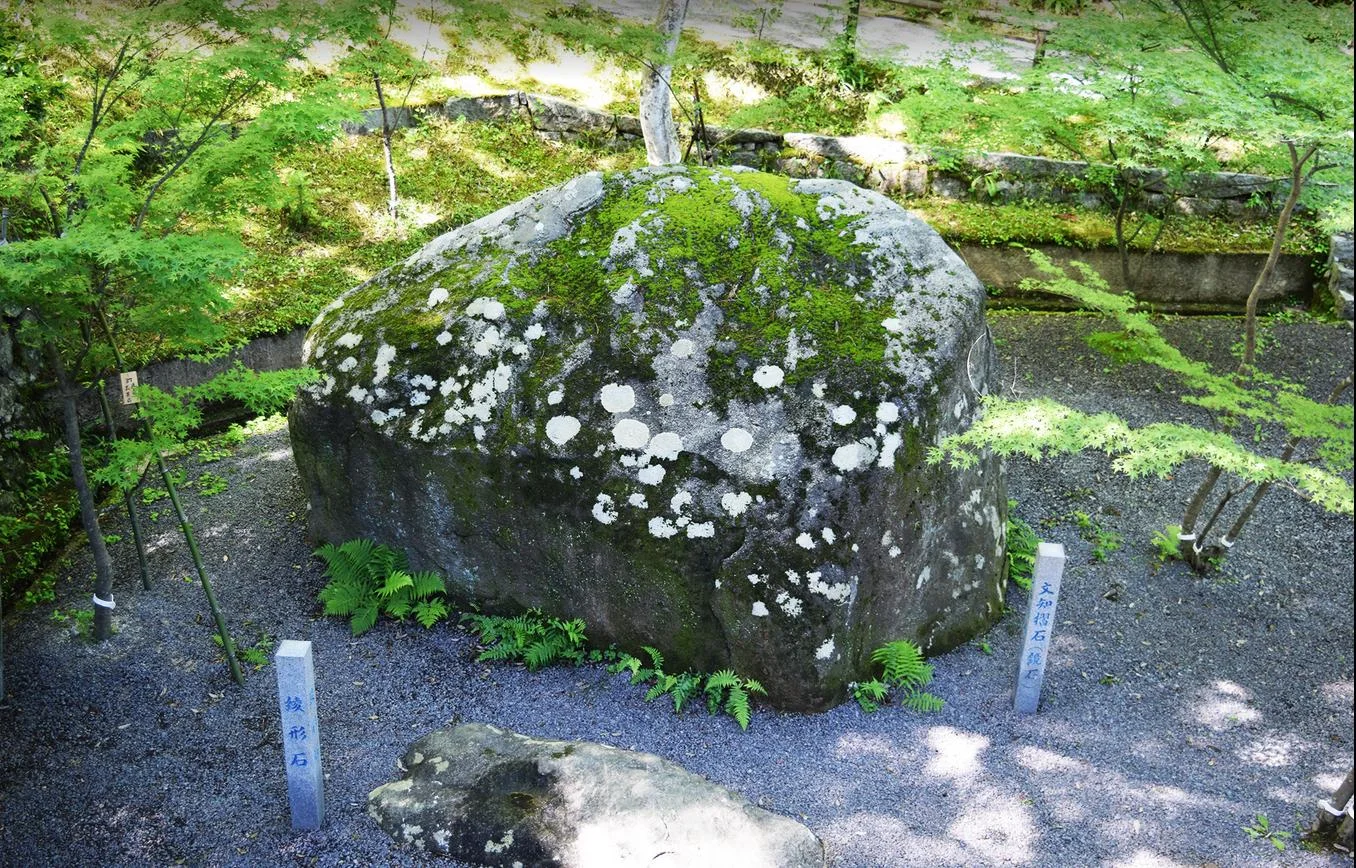Il s’agit d’une pierre sur laquelle on appliquait autrefois de la teinture de fougère (草の汁), plus précisément Davallia mariesii, pour y déposer ensuite le tissu à teindre en lui imprégnant des motifs verts désordonnés (ceux de la surface de la pierre).