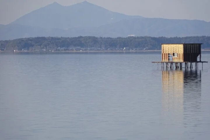 En bordure du lac Kasumigaura, un petit torii avec le mont Tsukuba en toile de fond