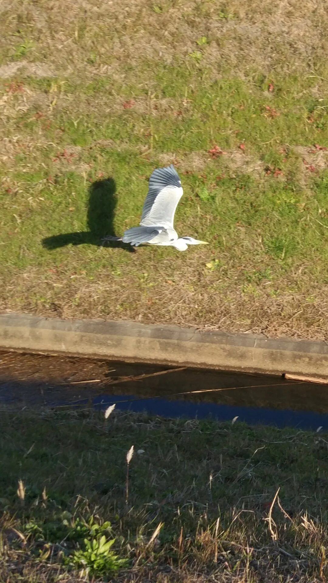 Dans le creux d’un petit canal que longe la piste cyclable, un アオサギ (héron cendré) prend la fuite en nous voyant approcher.