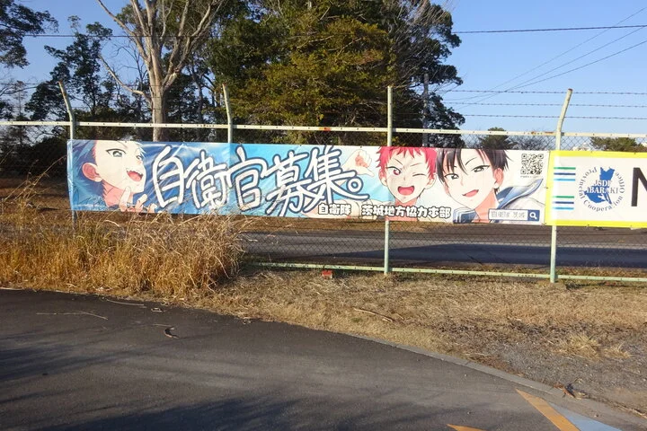À quelques kilomètres de la gare, une affiche de recrutement des forces d’autodéfense japonaises (自衛隊募集), dans un style adapté aux jeunes d’aujourd’hui
