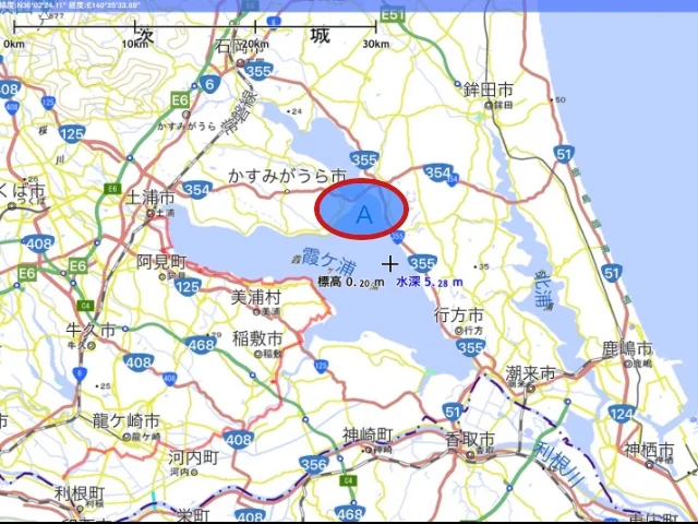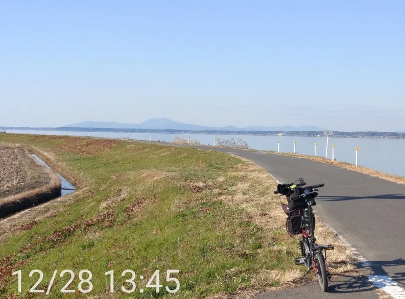 Le 28 décembre, nous sommes partis vers 9 h 00 du matin en direction du Kasumigaura (霞ヶ浦), ce grand lac de la préfecture d’Ibaraki entouré d’une longue piste cyclable dont le parcours s’étend sur quelque 130 km, mais qu’il est possible de raccourcir à 90 km en empruntant un pont (au point A sur la carte). 90 km en vélo pliant, c’est possible, d’autant plus que le paysage y est plat. Ceux qui roulent en vélo de route peuvent ajouter une quarantaine de kilomètres à ce tour du lac en poursuivant vers le (ou en venant du) mont Tsukuba, sur la piste cyclable de l’ancienne voie ferrée.