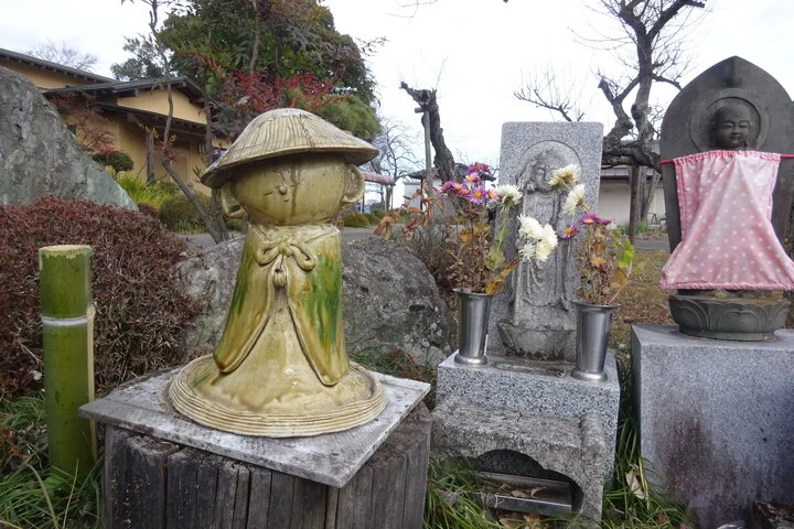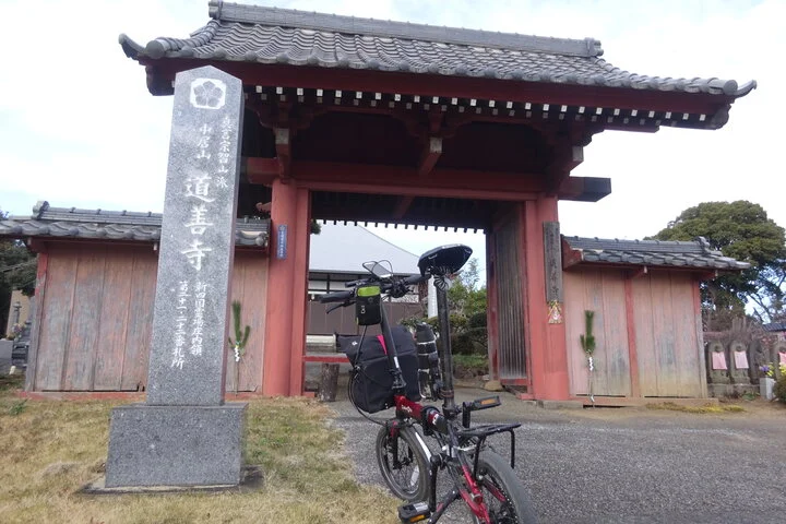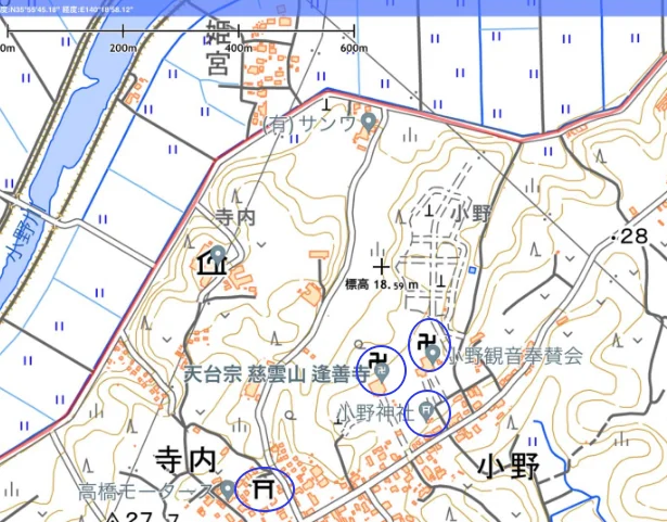 Pour la pause du midi, il avait d’abord consulté Super Topo pour aller casser la croûte dans un parc. Le hic, c’est qu’il y a peu de parcs aménagés dans la campagne. En revanche, on y croise un peu partout des sanctuaires (→ shintoïsme) et des temples (→ bouddhisme), qui s’affichent respectivement sur la carte avec les symboles du torii (⛩) et du svastika lévogyre (façon comme une autre de se faire des nœuds dans la langue au lieu de dire simplement « croix gammée » 卍).