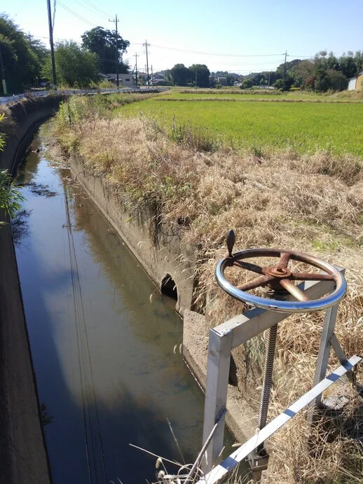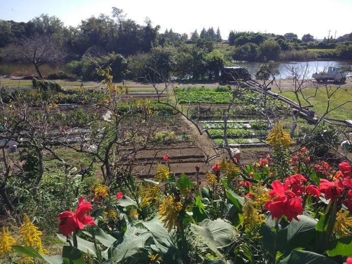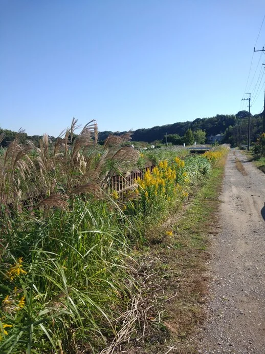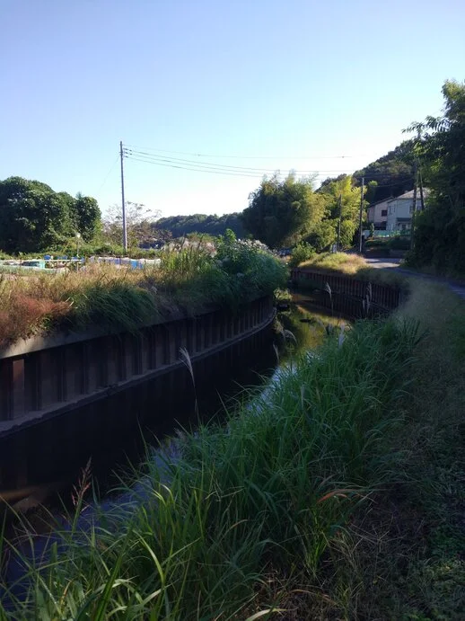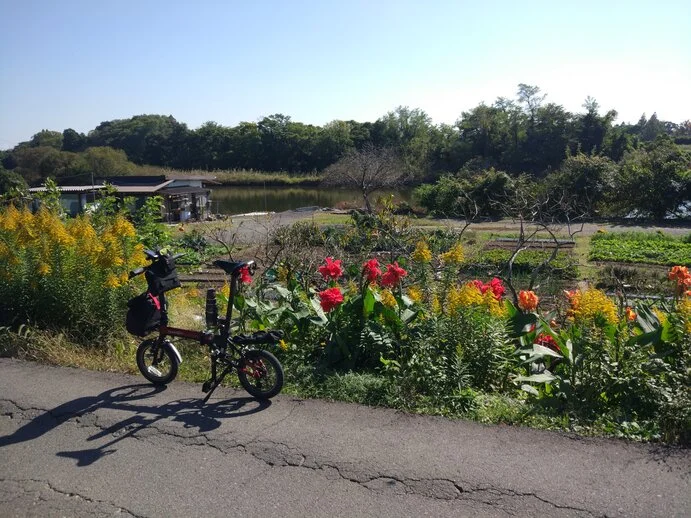 Dans le bourg de Sakae, juste comme nous allions retourner sur la piste cyclable pour progresser plus vite vers l’est, le cours de la rivière Nagato (長門川) s’est comme qui dirait emparé du guidon, tellement les jardins potagers et les fleurs en bordure du chemin attiraient le regard, entraînant du même coup les mains de celui qui guidait Béni-le-Rouge, lequel ne s’est pas fait prier pour aller vers le sud.