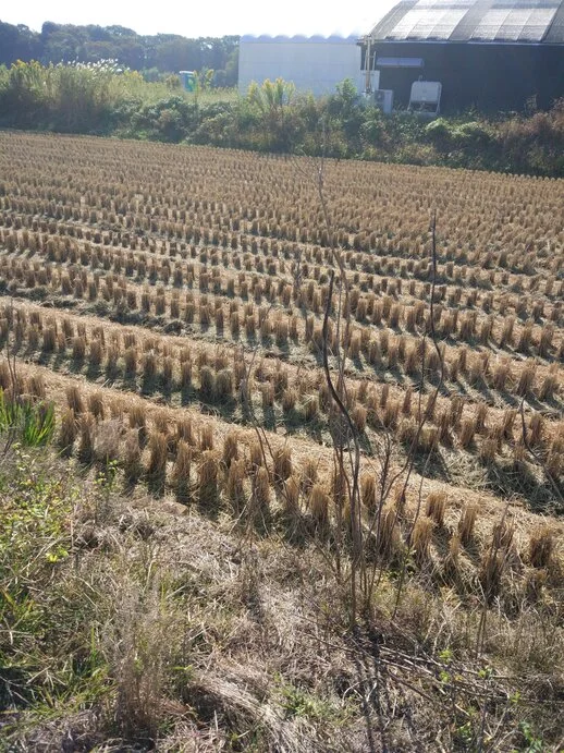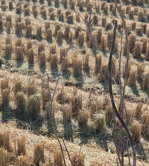 À un tournant, il y avait des tiges de riz coupées.