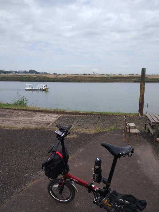 Il était environ 11 h, le petit traversier approchait lentement du quai désert. Puis le capitaine est descendu et nous a demandé si nous voulions monter à bord pour traverser. Je dis « nous » parce que les vélos peuvent également faire la traversée, et même gratuitement. Pour les bipèdes, c’est 200 yens pour traverser, 400 pour faire la boucle. Et moitié prix pour les enfants. Pour les nourrissons et pour les résidents du quartier (小堀地区), c’est gratuit, gratuité qui se comprend quand on connaît l’histoire du cours du fleuve (comme vous maintenant).