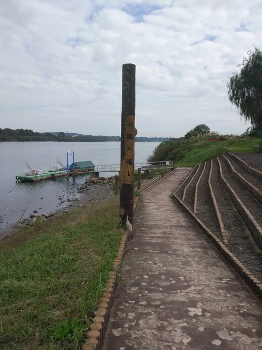 Le fleuve, qui coule aujourd’hui plus au nord, passait autrefois par ici après avoir bifurqué brusquement vers le sud, ce qui causait des débordements lors du passage des typhons. Cette bifurcation naturelle a donc été gommée artificiellement par la main de l’homme, pour que le fleuve coule sagement et tout droit vers l’est. Ce détournement (réalisé de 1907 à 1920) a toutefois eu pour conséquence que des gens qui habitaient jusque-là dans le sud de la ville de Toride (取手市), près de la rive nord du fleuve, se sont soudainement retrouvé sur sa rive sud, où commençait jusque-là la ville d’Abiko. Et comme il n’y avait pas encore de pont à cette époque, ces habitants de Toride durent prendre le ferry, à partir de 1914, pour aller travailler ou pour se rendre à l’école.