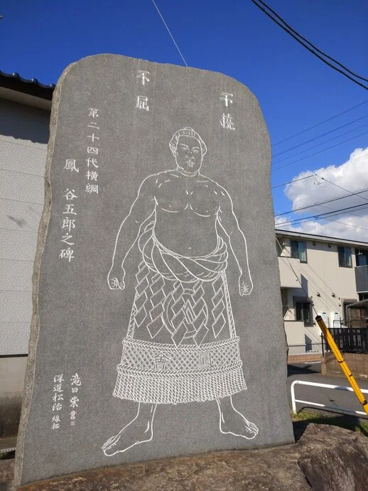 Ōtori Tanigorō, 1887-1956. La pierre dit qu’il a été le vingt-quatrième yokozuna. Elle se trouve à l’entrée d’un petit sanctuaire, dans la ville d’Inzai (印西市).