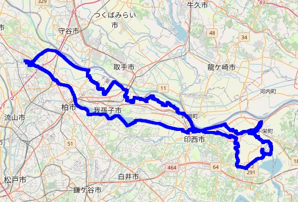 Sur cette carte, le tracé bleu est celui d’une éventuelle sortie vers la rivière Kokaigawa (小貝川) et le tracé rouge celui de la longue sortie effectuée samedi (29 octobre).
