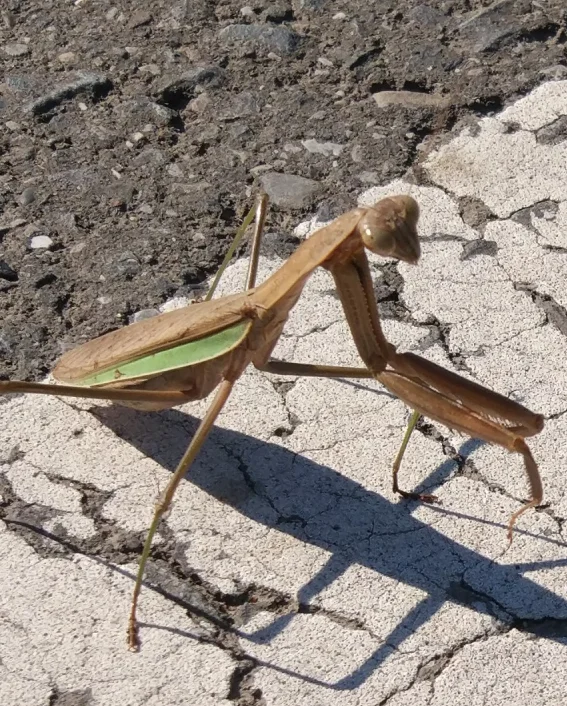 Avant d’arriver à cette adorable statue, nous avions fait quelques rencontres mémorables. Dont notamment celle d’une mante religieuse à la robe chocolatée qui se faisait bronzer sur la ligne blanche de l’accotement. Béni lui a demandé ce qu’elle faisait là, si près des voitures. Elle lui a donné la réponse typique de ces petites bêtes trop téméraires, à savoir : qu’elle n’avait peur de rien ni personne.