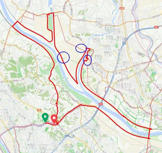 De retour sur la piste cyclable, nous avons traversé la Kinugawa et sommes repartis en sens inverse pour rejoindre les abords du fleuve, jusqu’à au point où, quelques kilomètres après une bifurcation nord-sud en V, la piste s’arrêtait soudainement (cercle de gauche sur la carte).
