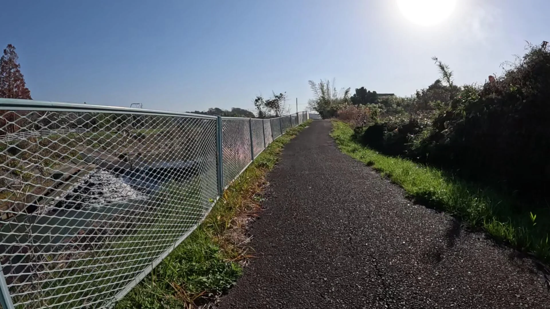 Cette clôture grillagée cachait la petite cascade aménagée dans la rivière. Visible à hauteur des yeux du cycliste, elle ne l’était pas pour la caméra.