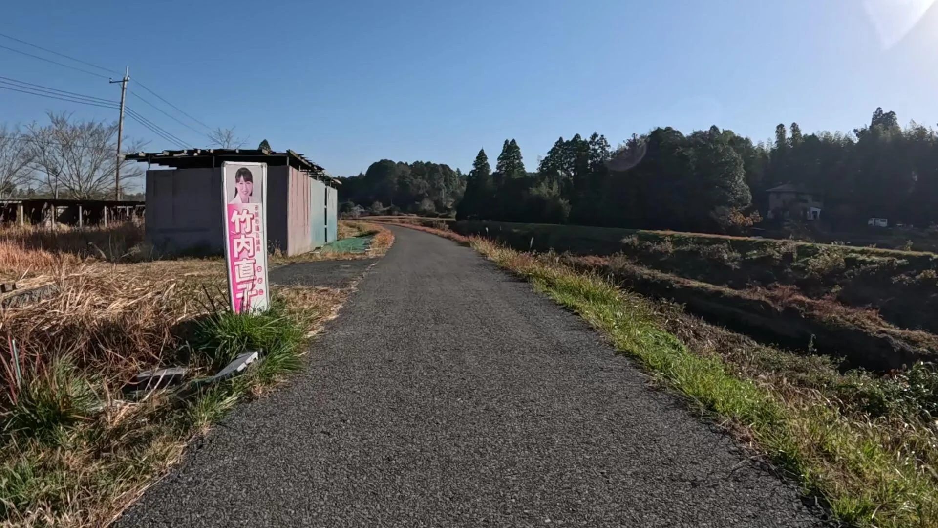 Dans ce coin désert, une politicienne du nom de TAKEUCHI Naoko a planté ou fait planter une affiche publicitaire. « Votez pour moi, cyclistes du dimanche et membres de Kinomap ! »