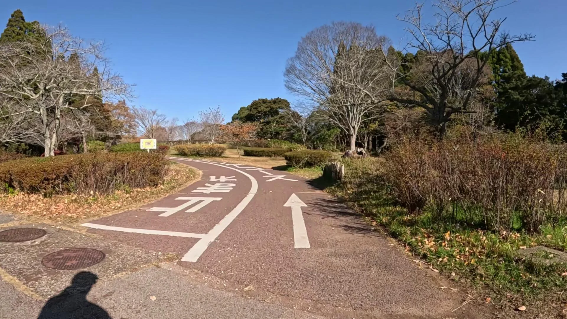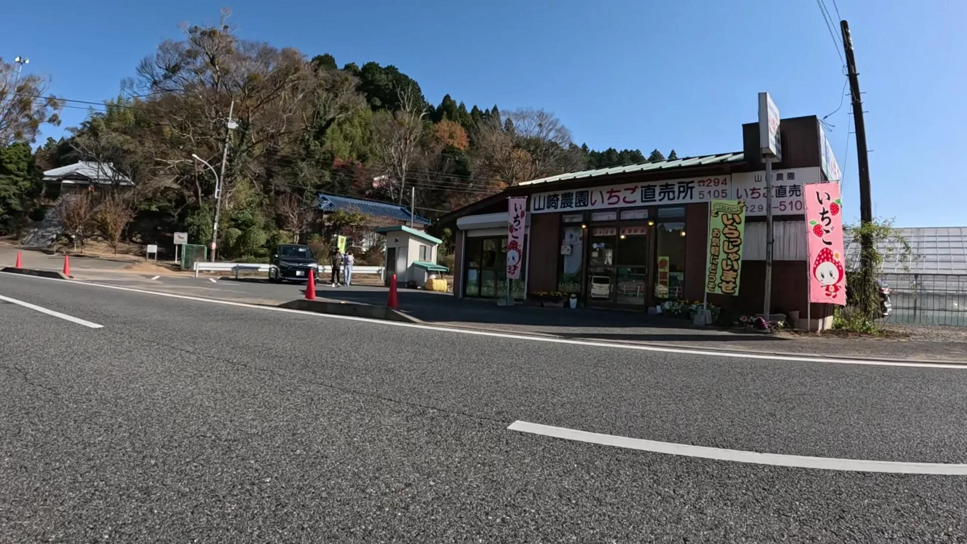 À part les petits embranchements ratés qui nous infligeaient des retours sur nous-mêmes en tête d’épingle, il y a eu très peu d’arrêts sur ce deuxième tronçon du parcours. Celui-ci s’est fait devant le petit kiosque rural de la ferme Yamazaki, kiosque spécialisé dans la vente de fraises. Une occasion idéale, pour mon compagnon bipède, d’aller acheter quelques fruits pour les déguster au grand parc aménagé dans la forêt de Shōwa (昭和の森), destination de ce deuxième tronçon. Malheureusement, il fallait continuer de filmer et passer devant sans s’arrêter…