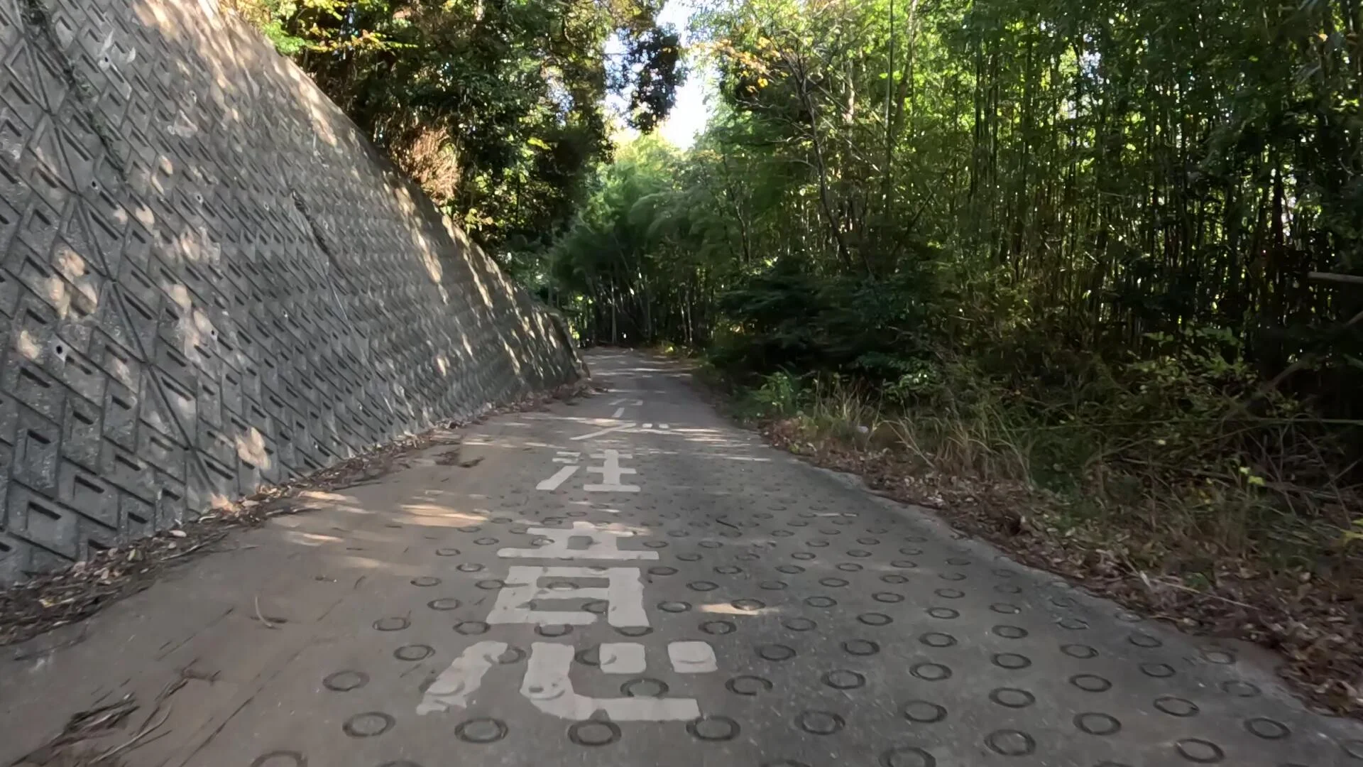 Des petits cercles sont parfois gravés dans le béton des pentes abruptes, pour éviter les dérapages. Le sol porte également l’inscription « Attention à la courbe » (カーブ注意), pour prévenir les collisions sur cette route étroite qui fait un virage à 90 degrés vers la gauche, tout en haut.