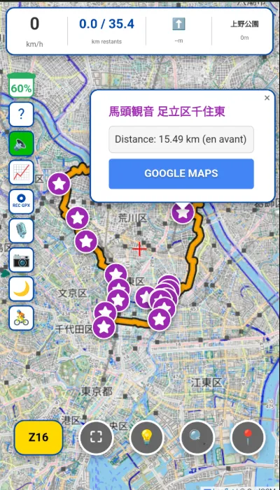À gauche, de haut en bas : la charge restante de la batterie, les instructions, le bouton d’activation/désactivation de la navigation sonore (1 bip pour un virage à gauche, 2 bips pour un virage à droite), le graphique de la pente (tracé complet, puis segment actuel de 2 km), le bouton d’activation/désactivation de l’enregistrement du parcours actuel au format gpx), le bouton de microphone pour prendre une note vocale, le bouton d’appareil photo pour prendre des photos sans quitter l’appli, le bouton de mode clair/sombre, et, si le cycliste est au Japon, le bouton de sélection de la carte du GSI (国土地理院) ou CyclOSM (ailleurs dans le monde, ce bouton ne s’affiche pas).