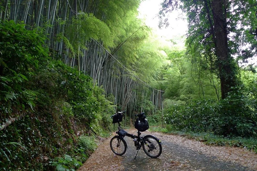 Cette photo a été prise à l’été 2015, dans la préfecture d’Ibaraki. Nous étions descendus à la gare d’Ishioka et avions roulé vers l’ouest, vers les petites montagnes du coin. Dans une descente bordée de bambous, Dahon m’a demandé de le prendre en photo.