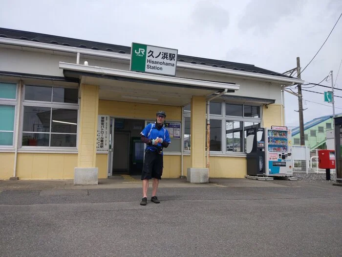 Parmi les gares candidates comme point de départ à Iwaki, c’est celle de Hisanohama qui a été retenue. La photo classique du départ de la gare a été prise… cette fois-ci avec une seule personne : Kotetchan (コテッチャン), qui n’est autre que le compagnon bipède de l’auteur de ces lignes, votre dévoué Béni-le-Rouge.