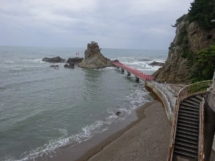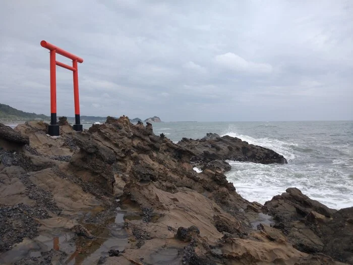 À ses pieds, un torii (鳥居) exposé aux vagues du Pacifique. Tout au loin, on distingue encore clairement le cap Tonogamisaki dans la direction d’où nous sommes venus.