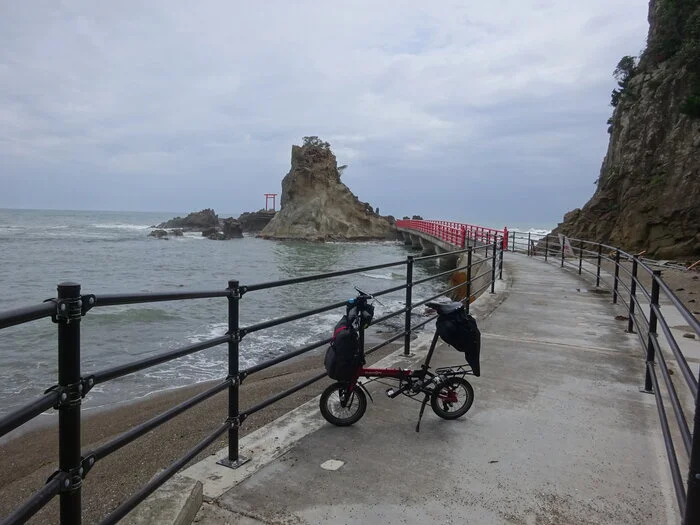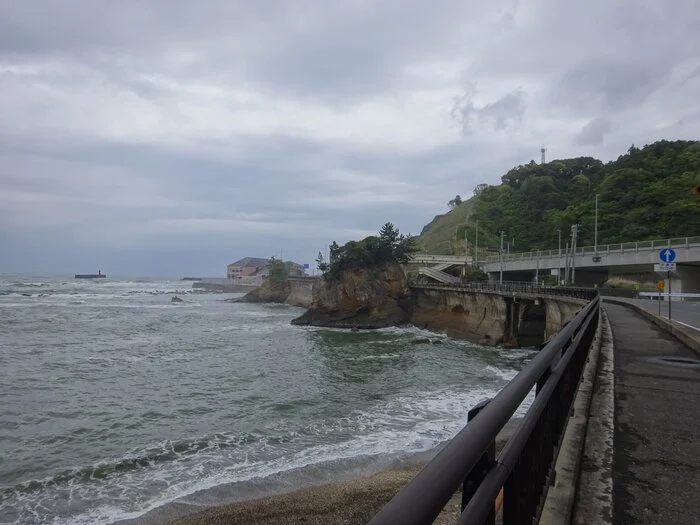 Laissant Benten-sama (弁天様) et l’eau froide derrière nous, nous remontons sur la piste pour nous engager dans le premier des deux tunnels piétonniers qui traversent les falaises vers le sud le long de la plage Funado ( 舟戸海岸 ). Puis nous roulons le long de la route 6 en serpentant vers la halte routière de Yotsukura ( 四倉の道の駅 ) .